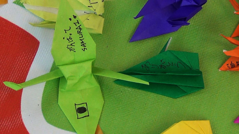 ボランティアのみなさんが、折鶴の折り方を1人1人丁寧に教えてくれています。こんな風に、「がんばれ日本」「ありがとう台湾」のメッセージを書いた折鶴を折ってもらいました。