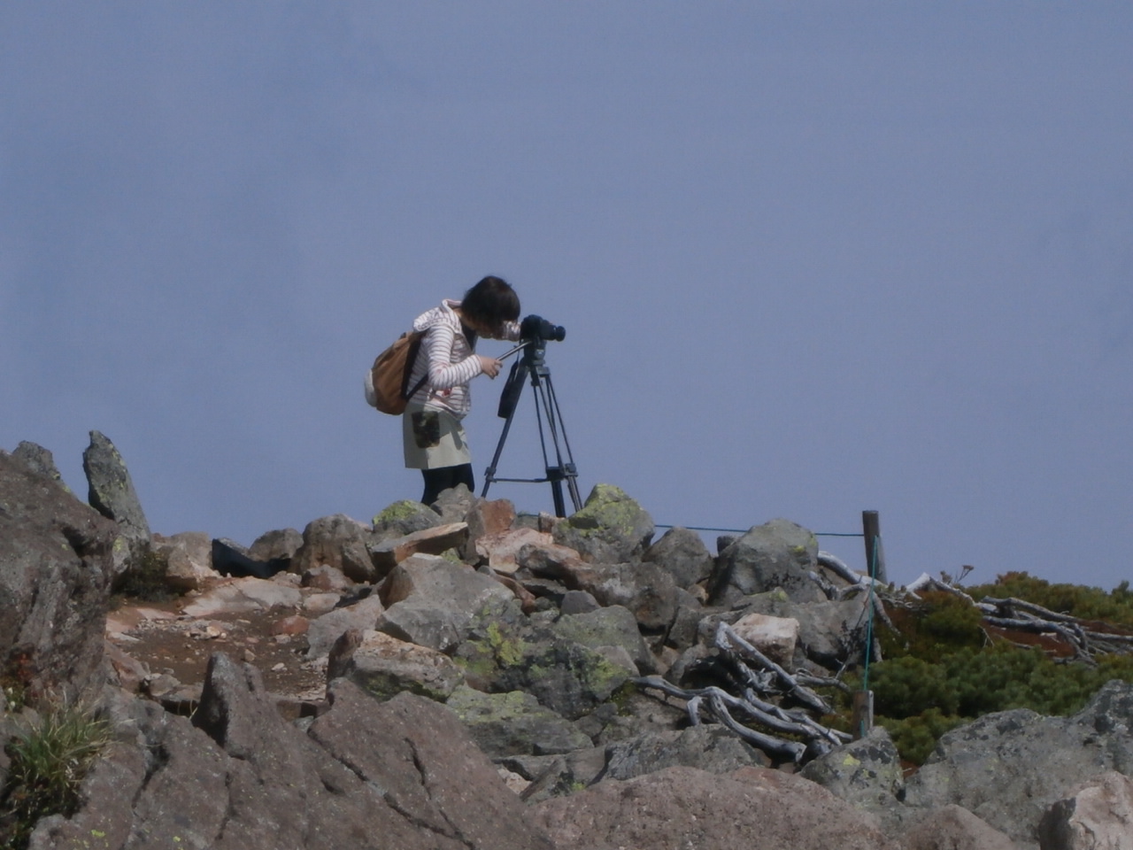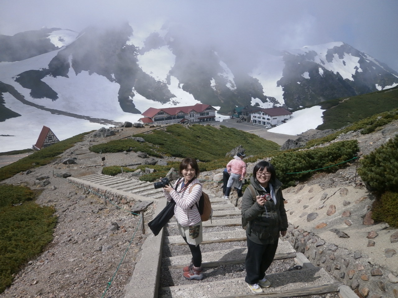 写真は、乗鞍岳の1つ。魔王岳の山頂にて。 6月7日に撮ったのですが、周囲は雪!若干空気が薄いのか、歩いていると呼吸が激しくなり、私と台湾育ちの張さんは、酸欠のキンギョみたいにパクパクしてしまいました。さすが、地元で育った中萩Dは、へっちゃらでどんどん登るのでビックリ。標高2764mですよ!! 生まれてから今まででに行った、最高に高い場所です。
