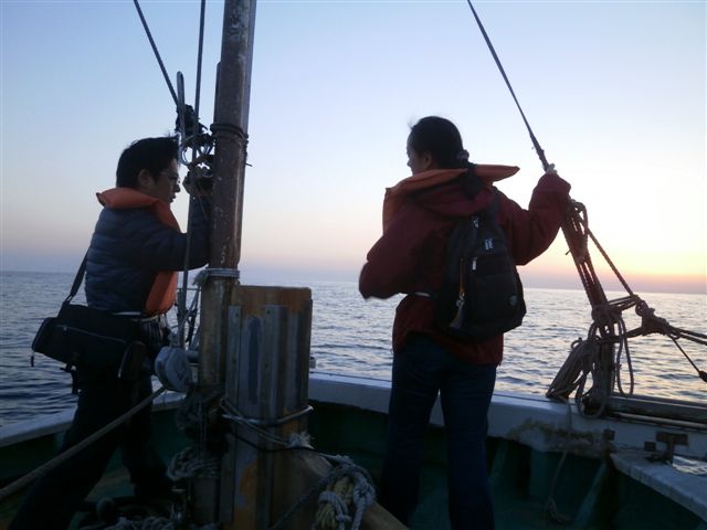 3)漁船からの日の出を見て取材する、中林Dと、沈さん。気分はタイタニックのヒロイン(^o^)