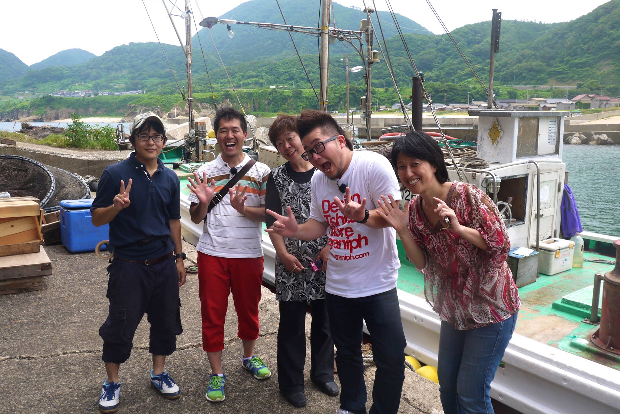 2)左から弊社中林、関西ウォーカー特集デスク藪さん、うまし宿 とト屋の女将 池田さん、京丹後で人気のアイドル!?ピーナッツさんと。