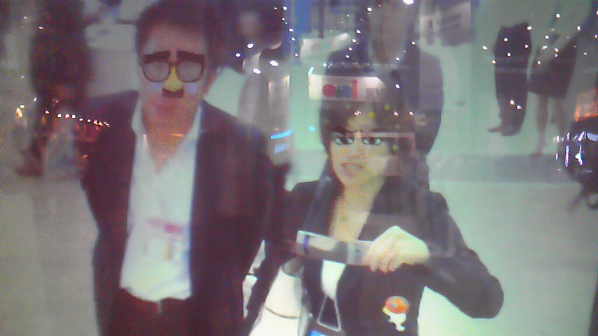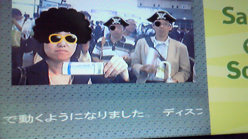 私の目が、劇画チックになっておりますが、この技術は、顔認識とアニメーションを組み合わせた「AR(強化現実・オーギュメントリアリティ)」です。