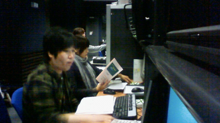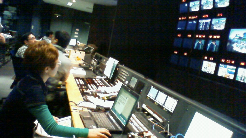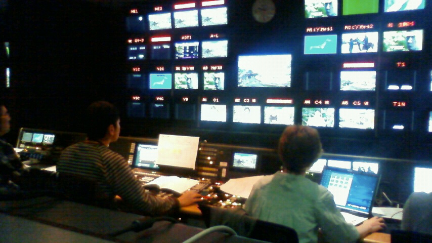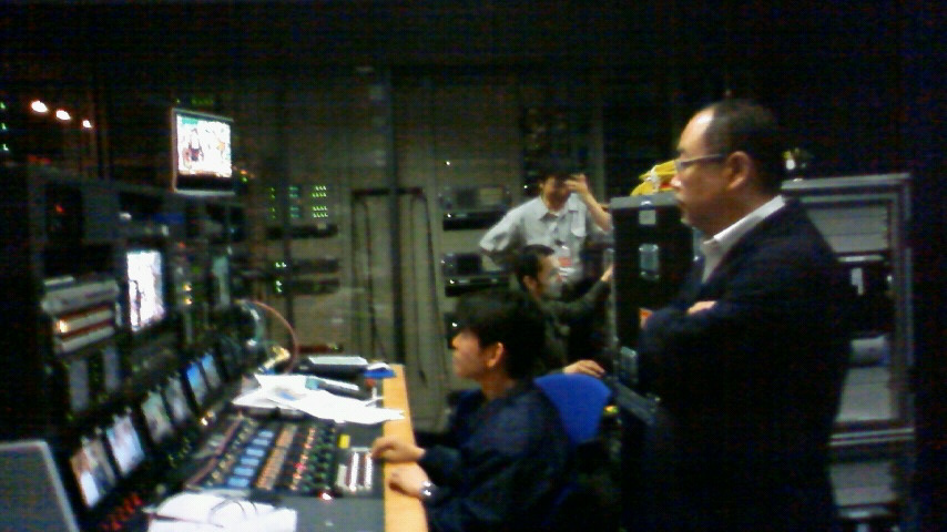 で作業するオペレータ、VE(ビデオエンジニア)さん、