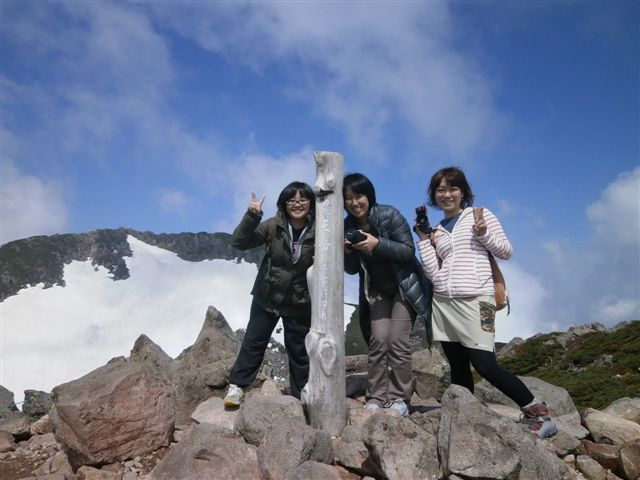 写真は、乗鞍岳の1つ。魔王岳の山頂にて。 6月7日に撮ったのですが、周囲は雪!若干空気が薄いのか、歩いていると呼吸が激しくなり、私と台湾育ちの張さんは、酸欠のキンギョみたいにパクパクしてしまいました。さすが、地元で育った中萩Dは、へっちゃらでどんどん登るのでビックリ。標高2764mですよ!! 生まれてから今まででに行った、最高に高い場所です。